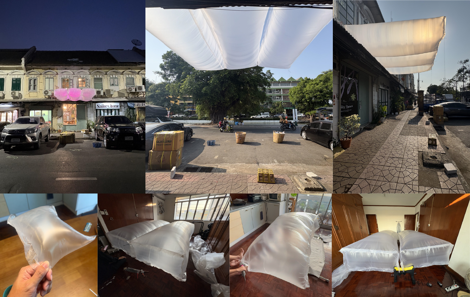 ผู้ออกแบบเลือกหยิบวัสดุพื้นฐานอย่าง “พลาสติก Polyethylene” ที่มีความบาง เบา และขุ่นมัว มาตีความใหม่ และการเชื่อมด้วยความร้อน (Heat Sealing) แสงที่ลอดผ่านความขุ่นของพลาสติกจะสร้างบรรยากาศที่นุ่มนวล (Ambient light) ให้กับผู้ที่อยู่ภายใต้ร่มเงา ในขณะที่อากาศภายในที่อัดแน่นจะเปลี่ยนพลาสติกธรรมดาให้กลายเป็นประติมากรรมที่มีมิติและทรงพลัง